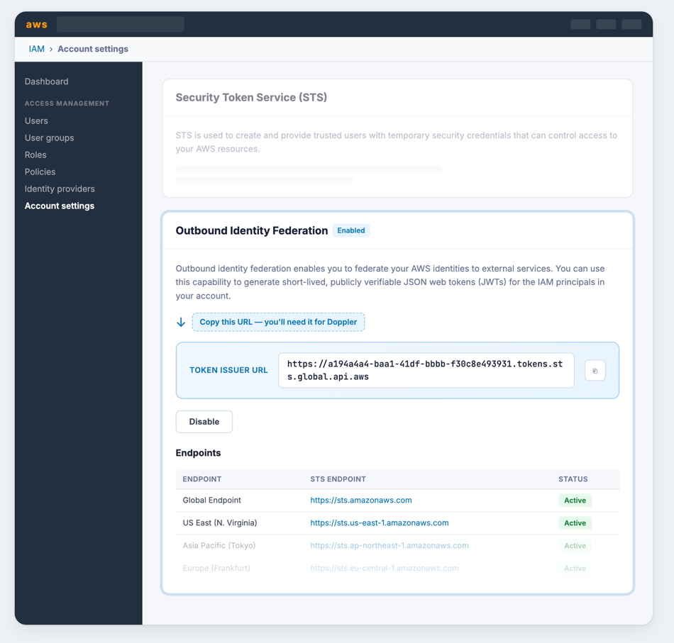The issuer URL is unique to your AWS account and won't change. It serves as the OIDC discovery endpoint that Doppler uses to verify tokens. AWS also provides regional STS endpoints (visible in the Endpoints table on the same page) that can be activated if you want to reduce latency by minting tokens from a region closer to your instances. The global endpoint works from any region by default.