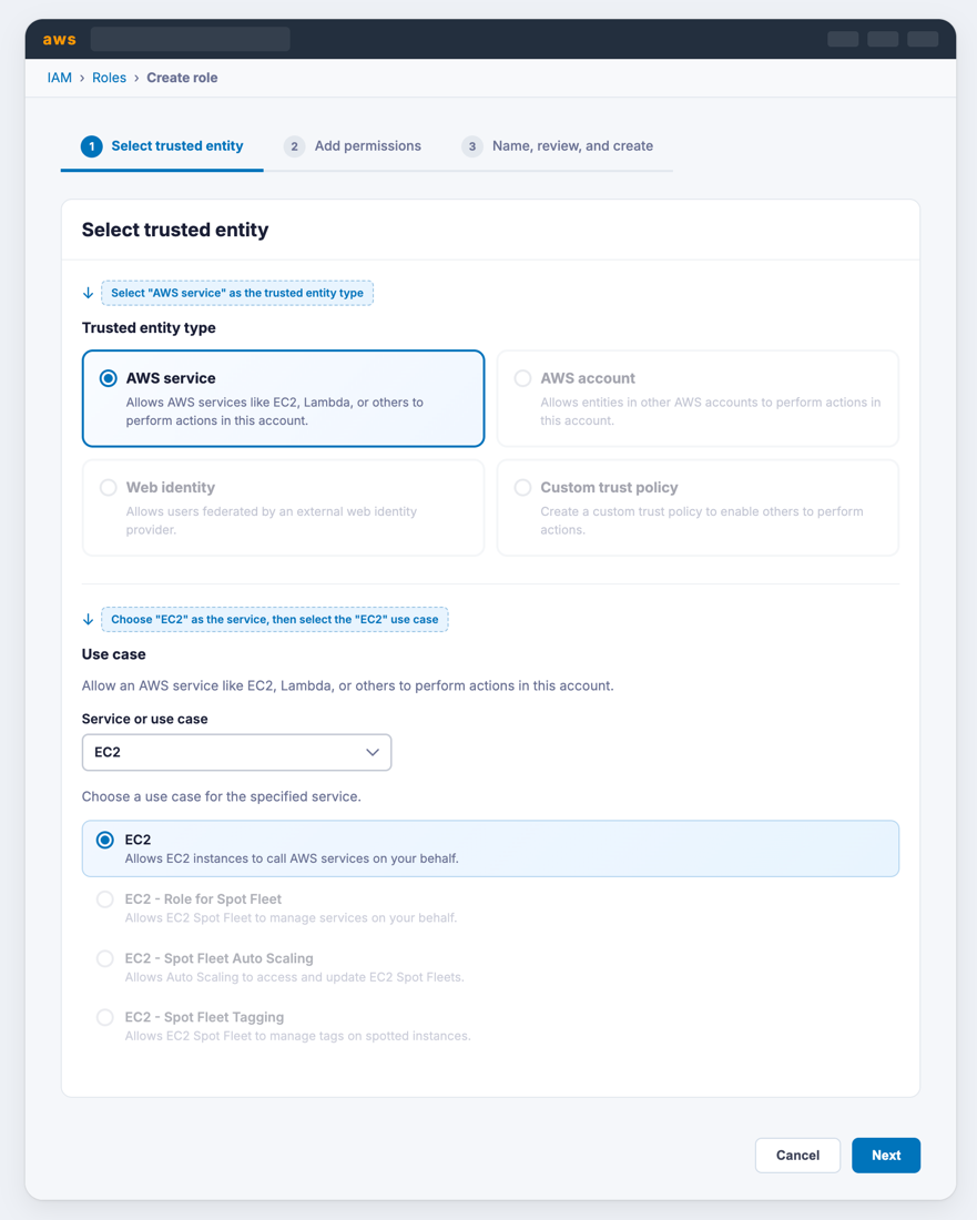 The role's trust policy (automatically created when you selected EC2 as the use case) should look like this: