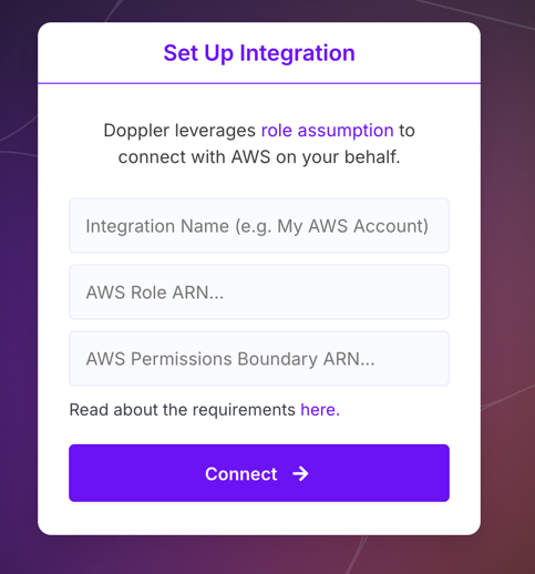 Name the integration, enter the ARN of the Managing User you created above, optionally (recommended) provide the ARN of an AWS Permission Boundary policy that will be applied to users that are created using this integration connection and click Connect.