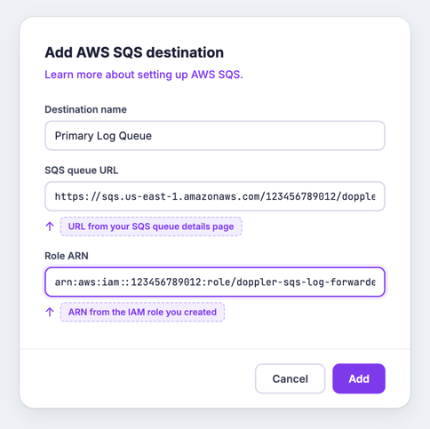 https://sqs.us-east-1.amazonaws.com/123456789012/doppler-activity-logs) - Role ARN ā the ARN of the IAM role you created above