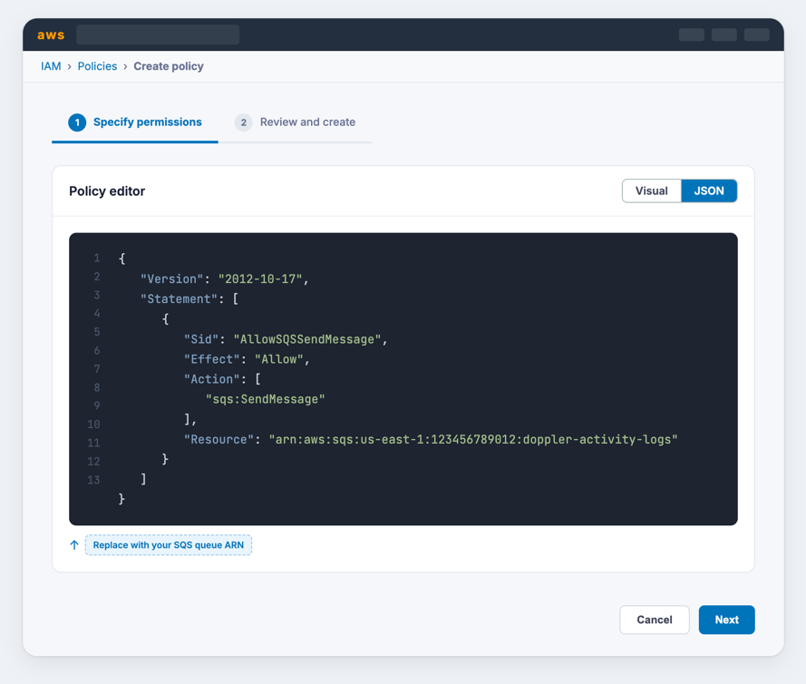 SSE-SQSor an AWS-managed key), you must also grant the Doppler rolekms:Decryptandkms:GenerateDataKeyon the key and update the key's policy to allow the role to use it. See the Custom KMS Key policy tab below.