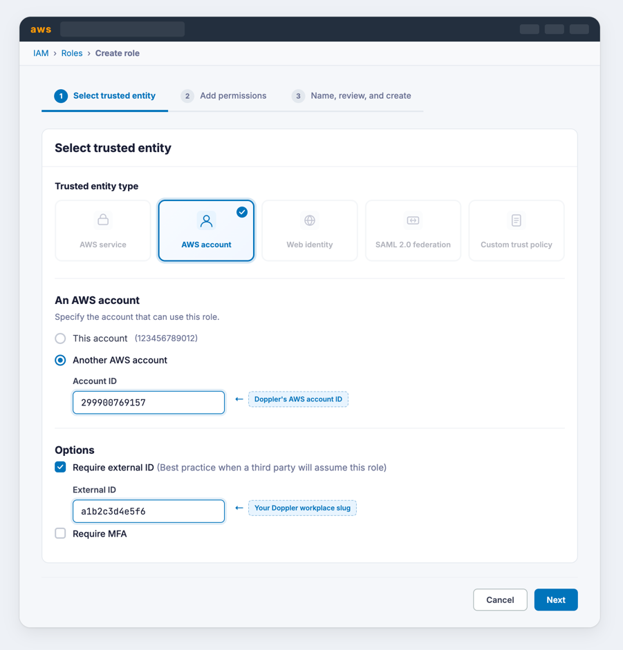 arn:aws:iam::299900769157:root(orarn:aws:iam::299900769157:user/doppler-integration-operator) as a trusted principal. - Confirm the External ID on the role matches your workplace slug exactly.