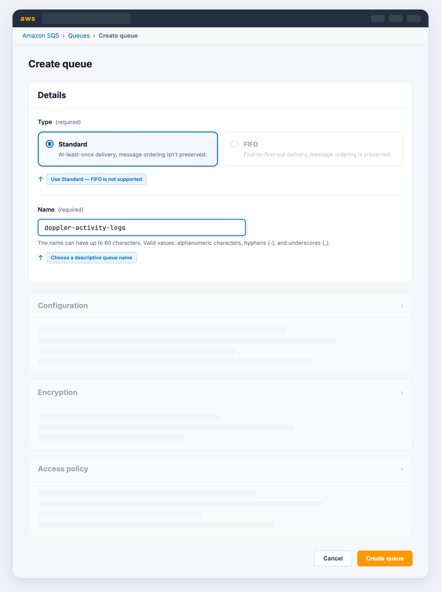 doppler-activity-logs) - Configure Encryption, Access policy, Dead-letter queue, and other settings as appropriate for your organization. The defaults are sufficient to get started.