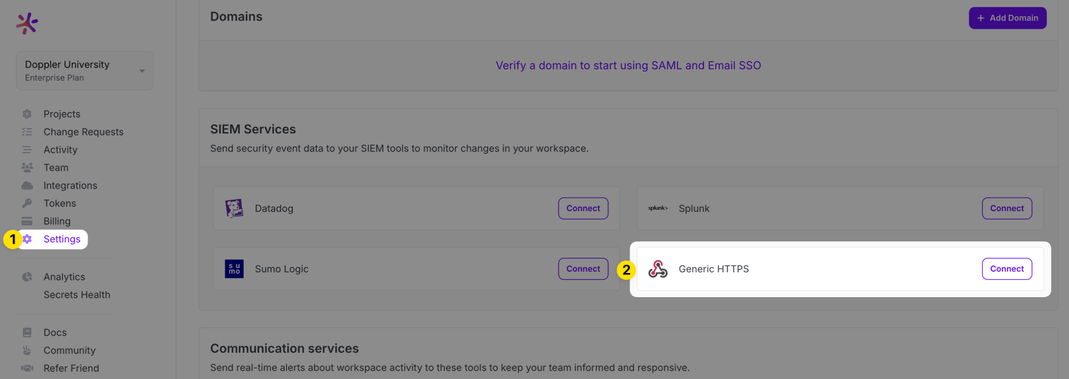 To setup activity log forwarding to a generic HTTPS webhook, browse to the workplace Settings page and scroll down to the Logging Services section. Then, click on the Connect button.